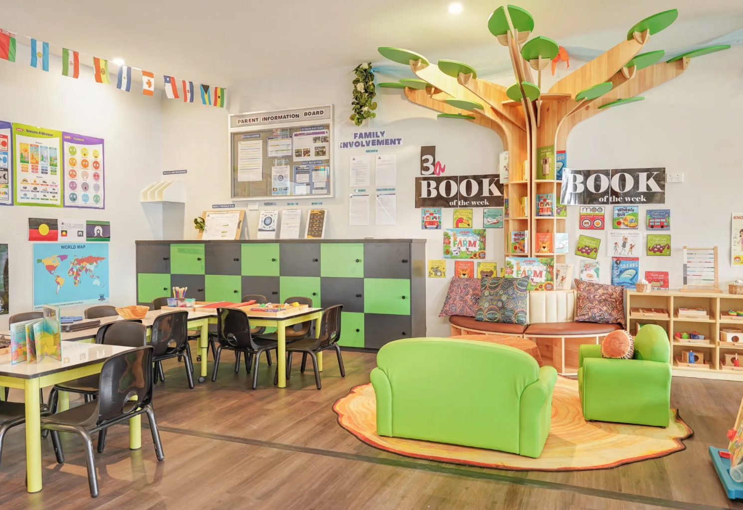 The Arbor is a triumph of “architectural beauty,” meticulously designed to serve as the soulful heart of a high-end educational space or a curated residential library. Inspired by the sprawling canopies of the Australian landscape, this 90-degree installation brings a sense of organic grandeur indoors. The trunk, crafted from premium, sustainably sourced timber, features a clean, slatted aesthetic that reflects a sophisticated “Coastal-Luxe” sensibility. Radiating from the central column are stylised timber branches supporting a lush canopy of vivid green leaves, creating a panoramic visual experience that encourages wonder. Whether situated in a sun-drenched Melbourne preschool or a bespoke private library in a Sydney residence, the Arbor acts as a radiant focal point that harmonises with the most discerning architectural visions. It is a piece that understands the power of the “prepared environment,” where the aesthetic quality of the space is as vital as its utility.
