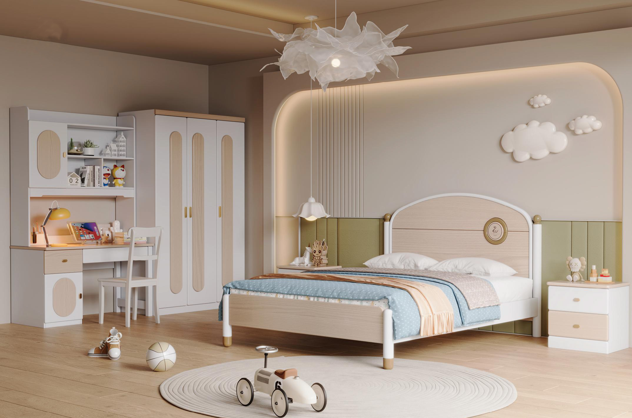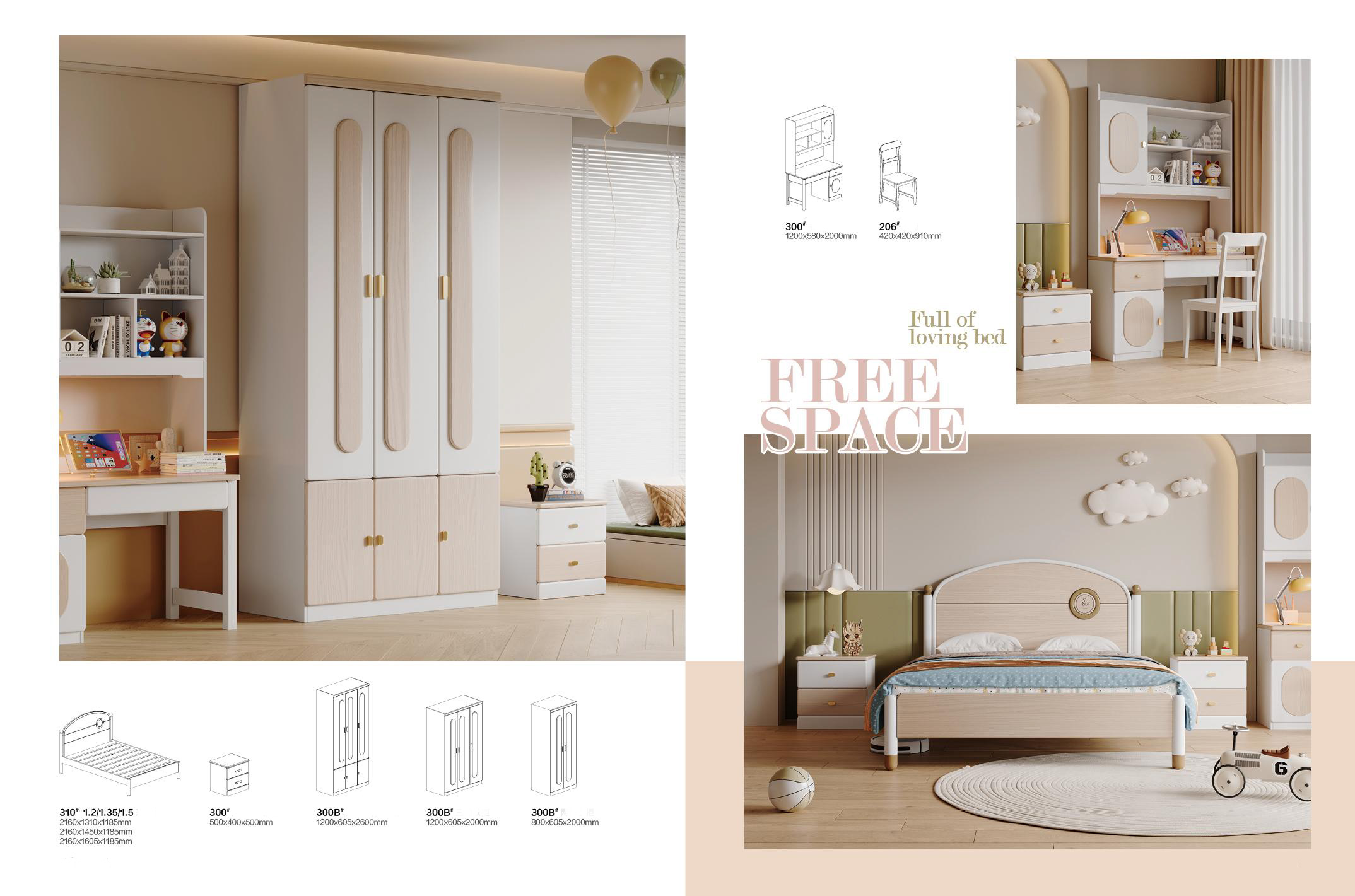 | Study Desk & Hutch | 1200 (W) x 580 (D) x 2000 (H) | Integrated desk with overhead cabinetry featuring oval timber panels. |