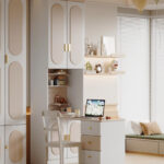 • Vertical Cognitive Flow: The tall, integrated cabinetry acts as a visual guide for the “grace and courtesy” of organization. By utilizing the room’s vertical space, the atelier keeps the primary desktop clear for deep focus, reading, and creative “flow.”