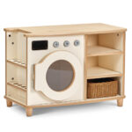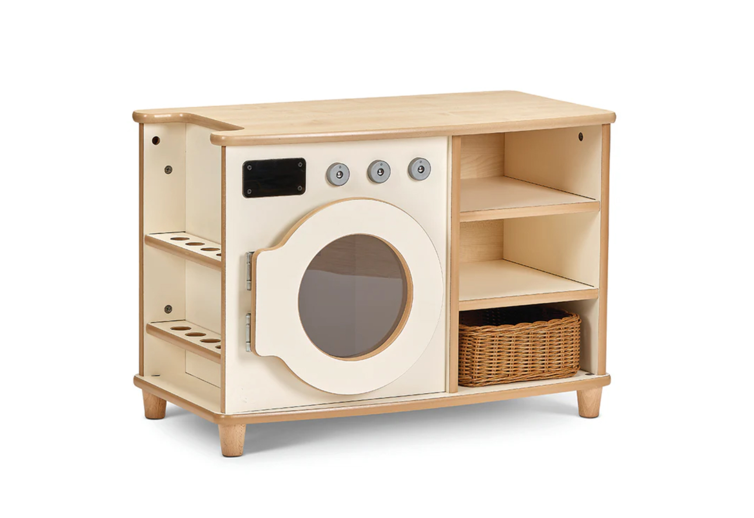For the professional interior designer, the Lavoir offers a unique opportunity to define a “practical life zone” that remains visually airy and ordered. The unit’s architecture is perfectly balanced, featuring a realistic “Spin-Luxe” washing machine interface alongside a high-capacity storage grid and side specimen shelves. This rhythmic geometry allows for the total organization of play resources without the need for disjointed pieces of furniture. The neutral timber palette reflects natural light, ensuring the nursery or discovery zone remains an inviting and inspiring environment. This is furniture designed to be showcased; it reflects a lifestyle where every object in the home must meet an uncompromising standard of elegance. By choosing the Lavoir, you are investing in a piece that treats the child’s world with the same architectural rigour and aesthetic reverence as a bespoke adult utility suite.