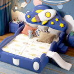 Why simply wake up when you can launch gracefully into a brand new day of cosmic discovery? What elevates this piece to the absolute pinnacle of luxury children’s furniture is the fabulous, built-in side slide. Designed with a gentle, perfectly calibrated incline specifically suited for the 3 to 6-year-old age bracket, the sleek white slide offers a smooth, thrilling, and completely safe descent every single morning. Accompanying the slide is a stunning, contrasting set of fully upholstered, deep blue two-tier steps. These sturdy, padded stairs empower your toddler with the independence to climb up into their space capsule safely and easily. This highly interactive element not only makes the morning and evening routines infinitely more enjoyable but actively aids in the development of vital gross motor skills, balance, and physical confidence in early childhood.