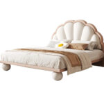The undisputed crowning glory of this magnificent designer bed is its commanding, beautifully contoured headboard. Stepping completely away from standard, rigid flat panels, the design features deep, vertical channel tufting that fans outward, creating an incredibly plush, ribbed effect that perfectly mimics a giant, elegant seashell or a blooming flower petal. The design utilizes a stunning, sophisticated two-tone colour palette. The central tufting is rendered in a soft, pristine cream, elegantly framed by a smooth, raised outer border in a muted, earthy blush pink. This elevated designer touch gives the bed a unique, luxurious personality, transforming it from a mere piece of furniture into a chic bedroom focal point. Beyond its breathtaking visual aesthetic, the generously padded, tufted headboard serves a highly practical purpose, offering a supremely plush and supportive backrest. It is the ideal, cozy haven for you and your child to lean against during evening storytime, reading magical tales of ocean adventures before drifting off to a peaceful sleep.