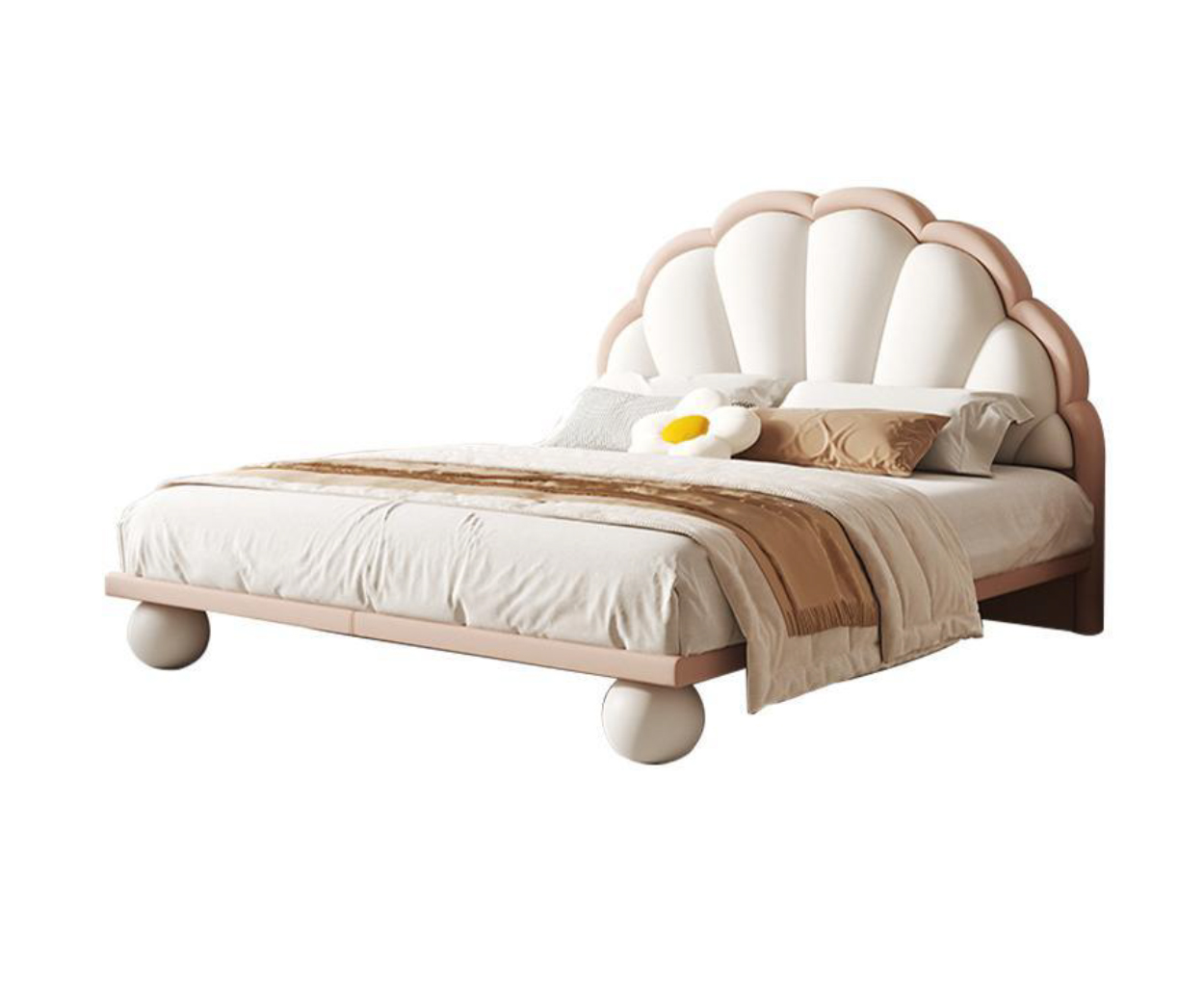 • Modern Spherical Feet: Oversized, playful white round legs resembling pearls that elevate the design and promote essential mattress airflow.