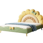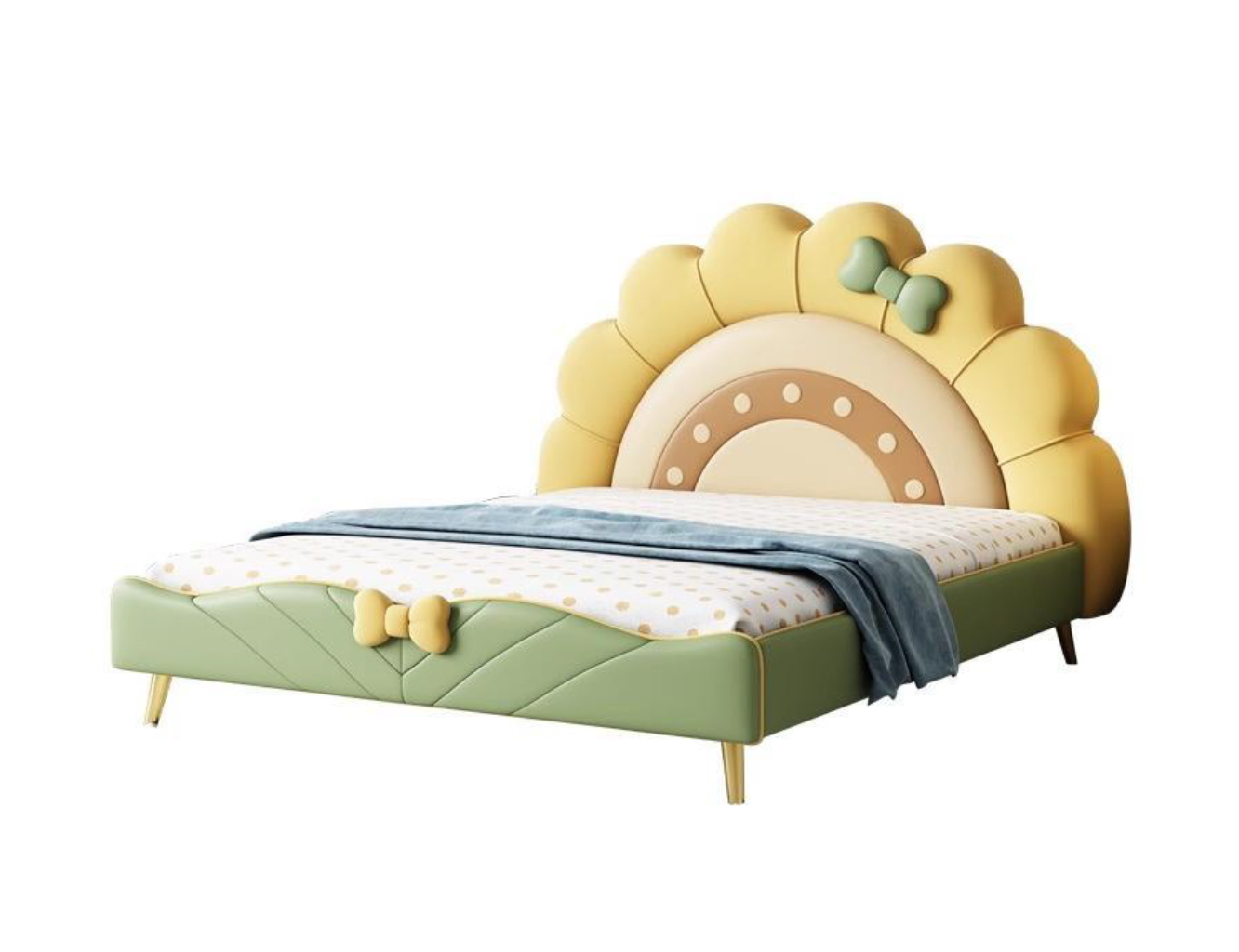 The undisputed centerpiece of this magnificent designer bed is its incredibly chic, organically shaped headboard. Stepping away from traditional, rigid rectangular frames, this bed embraces a beautifully rounded, scalloped silhouette that perfectly mimics a radiant rising sun or a softly blooming garden flower. The design utilizes a stunning, sophisticated multi-tone pastel colour palette. The magnificent outer scalloped edge is rendered in a soft, cheerful pastel yellow, beautifully framing a smooth, creamy beige inner arch adorned with subtle, playful dot accents. Adding an incredible layer of bespoke, designer charm, the upper right curve of the headboard is elegantly accented with a tactile, 3D upholstered bow in a muted sage green. This elevated designer touch gives the bed a unique, luxurious personality, transforming it from a mere piece of furniture into a chic bedroom focal point that radiates warmth and positivity. Beyond its breathtaking visual aesthetic, the generously padded headboard provides a supremely plush and supportive backrest. It is the ideal, cozy haven for you and your child to lean against during evening storytime, reading beautiful botanical tales before drifting off to a deeply restorative sleep.
