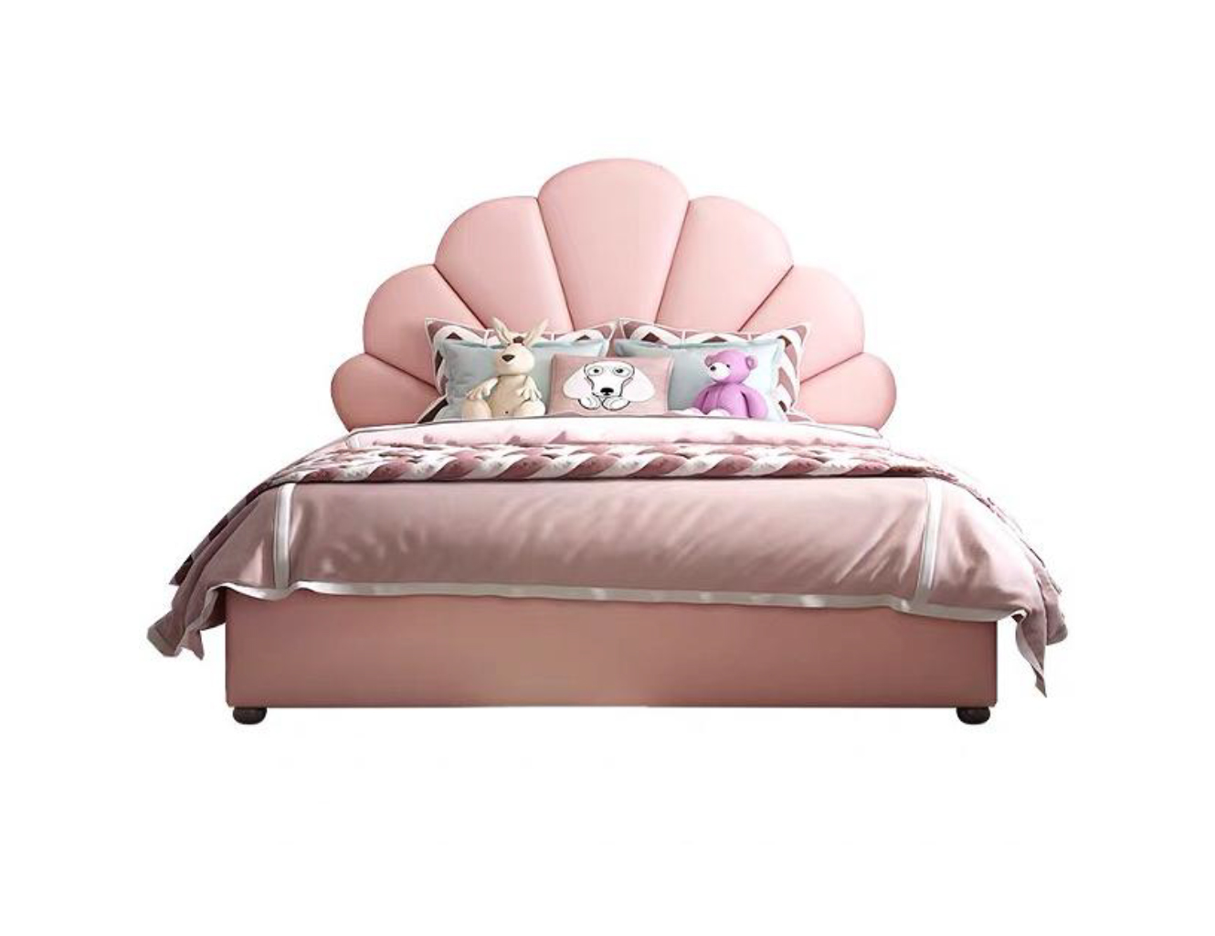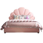 The undisputed crowning jewel of this magnificent designer bed is its mesmerising seashell headboard. Moving away from standard, rigid frames, this bed embraces a gentle, organic aesthetic with a deeply channeled, radiating scallop design. The oversized, beautifully curved panels mimic the elegant lines of a giant ocean pearl shell or a blooming lotus flower. This structural masterpiece is fully upholstered in a sumptuous, blush pink fabric that exudes a sense of calm and gentle warmth. Not only does this headboard serve as a stunning, room-defining focal point, but its plush, padded surface provides the ultimate cozy backrest. It is the perfect, luxurious spot for you and your little one to lean against while reading enchanting tales of deep-sea adventures and magical mermaids before drifting off to sleep.