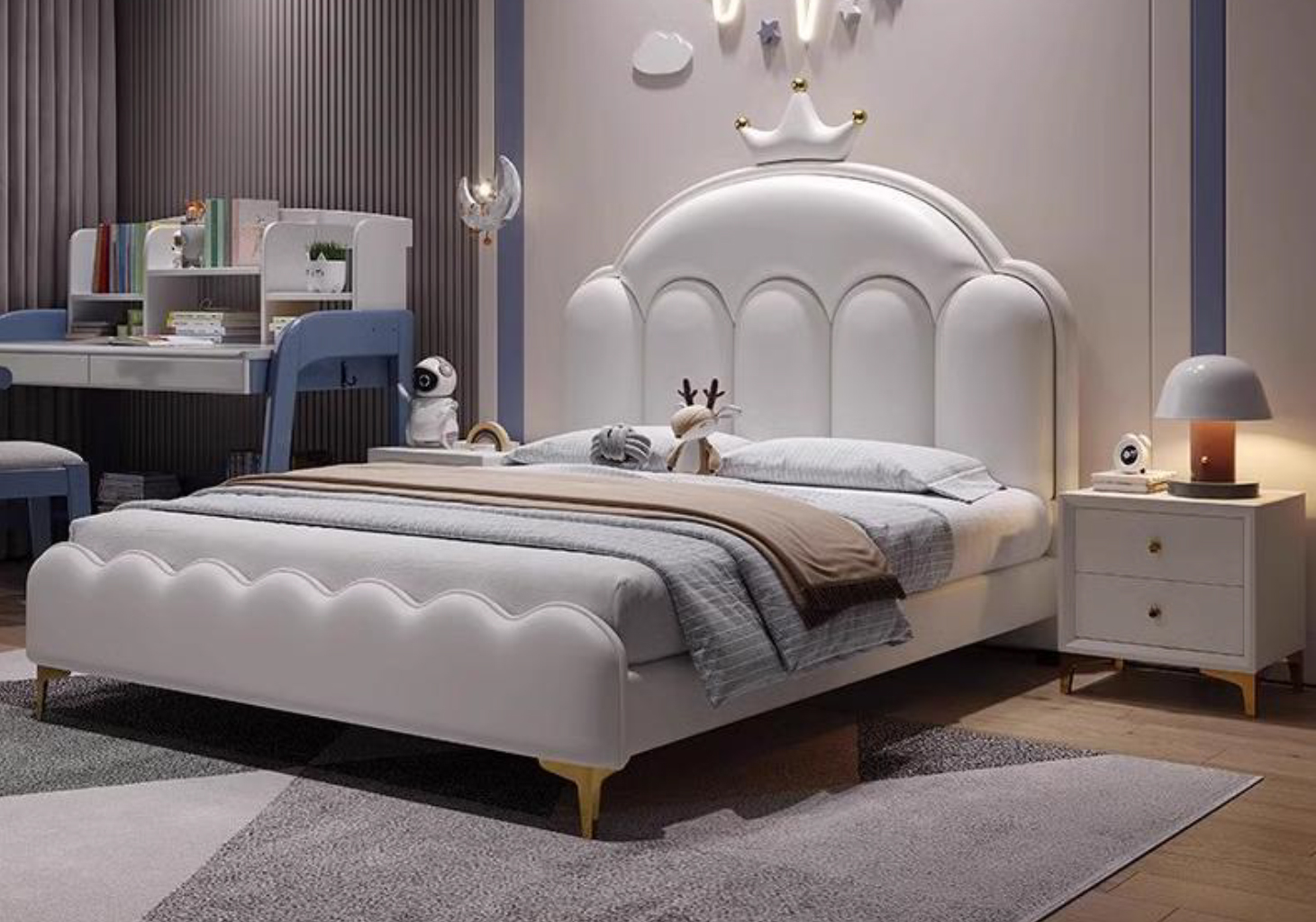 The undisputed crowning glory of this magnificent designer bed is its commanding, beautifully arched headboard. Stepping away from standard flat panels, the design features deep, vertical channel tufting that creates an incredibly plush, ribbed effect, adding visual height and a profound sense of classic luxury. Resting perfectly atop the central arch is a bespoke, 3D upholstered crown. This regal emblem is delicately accented with shining gold sphere finials at each peak, providing a subtle yet spectacular touch of glamour. Beyond its breathtaking visual aesthetic, the generously padded, tufted headboard serves a highly practical purpose, offering a supremely plush and supportive backrest. It is the ideal, cozy haven for you and your child to lean against during evening storytime, reading tales of brave knights, wise rulers, and magical kingdoms before drifting off to a peaceful sleep.