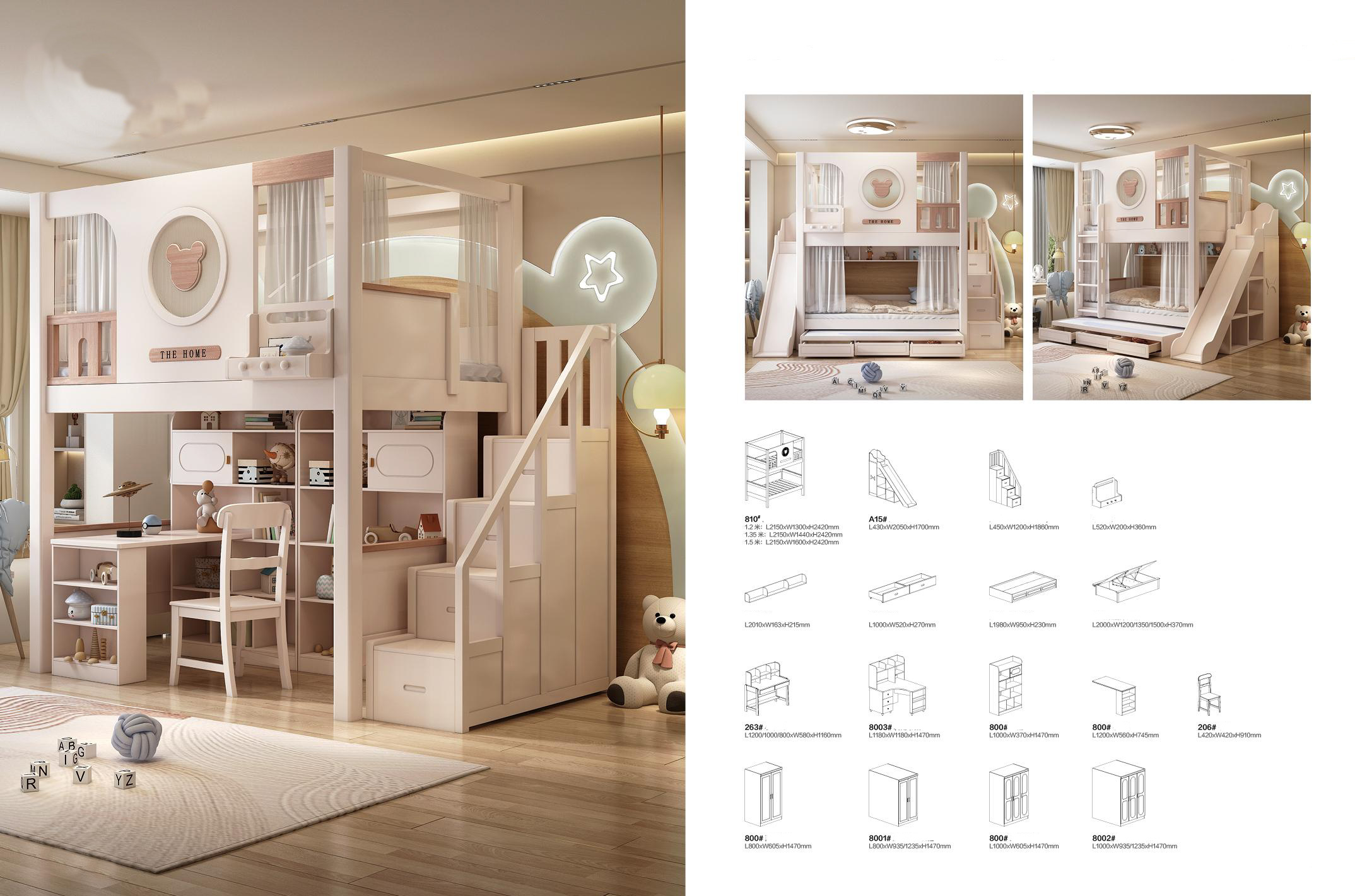 | Integrated Study Desk (Loft Config) | 1200 (W) x 1000/800 (D) x 1600 (H) | Built-in study station with expansive desktop and integrated shelving. |