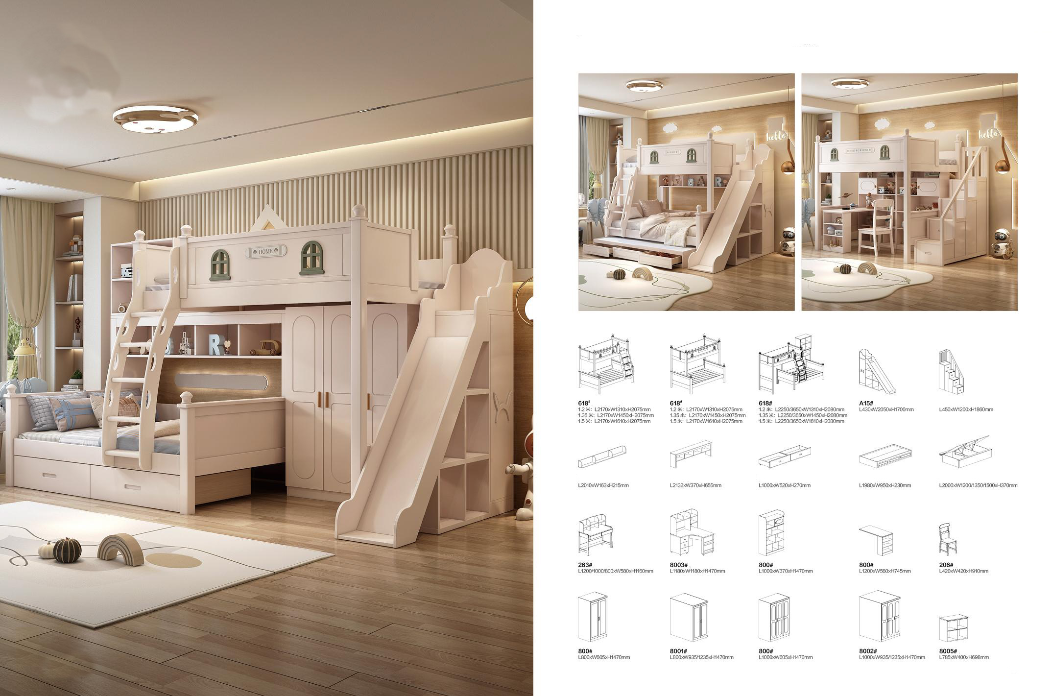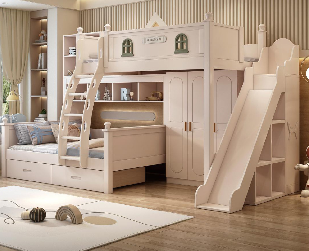 • Configuration: Highly Modular Suite (Convertible between L-Shape Wardrobe Bunk and Study Loft) with Storage Stairs, Play Slide, and Pull-Out Trundle.