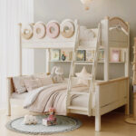 • Features: Signature “O-handle” safety rails, arched headboards with cloud motifs, integrated wide-step ladder, and built-in bookshelf.