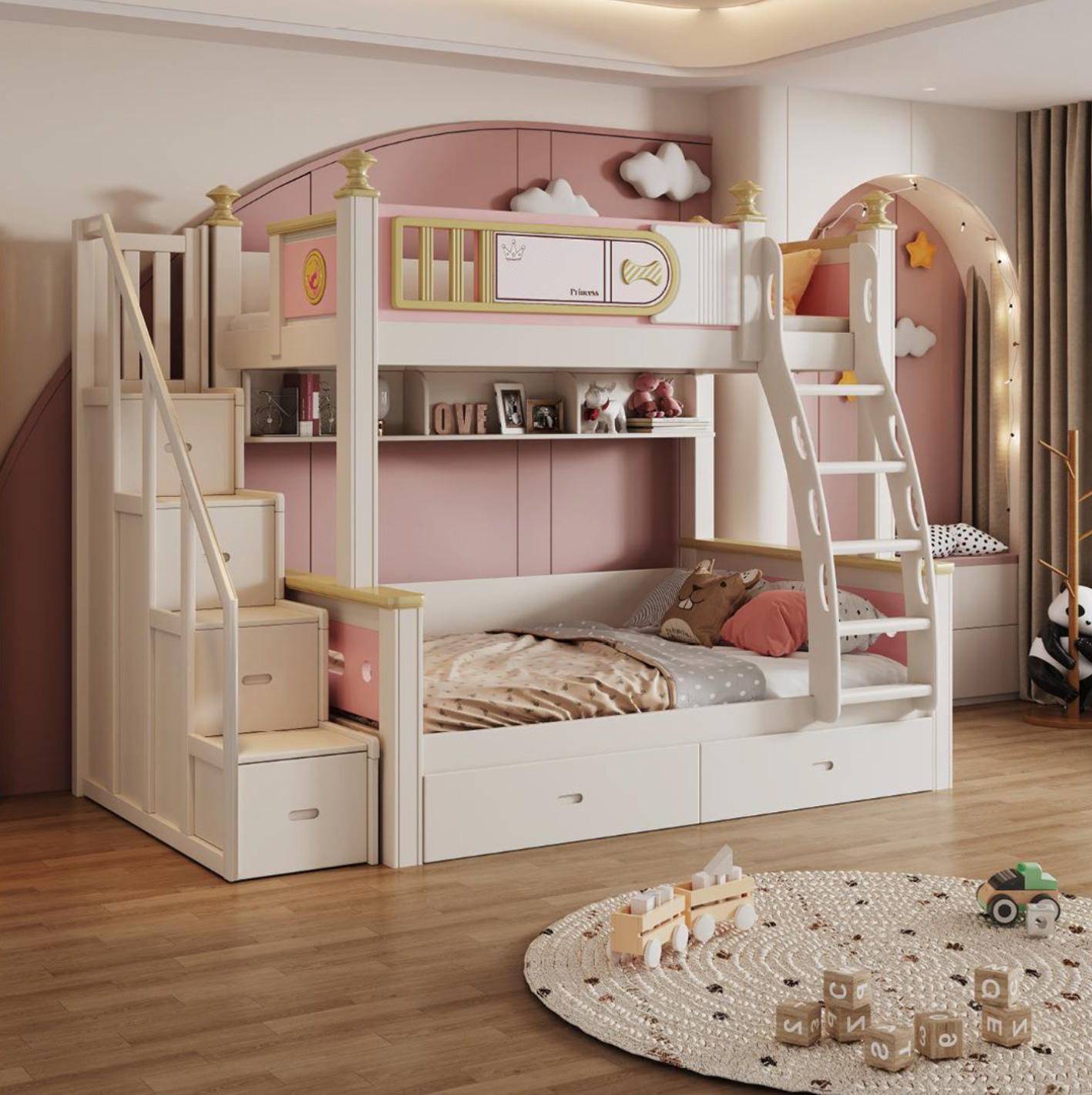 Moving away from utilitarian metal frames, the Isabella acts as a breathtaking centrepiece. Finished in a sophisticated palette of Warm White and Soft Rose Pink, and elevated by striking metallic-gold finials that mimic castle spires, this bunk bed is a true heirloom piece designed for the modern little princess.