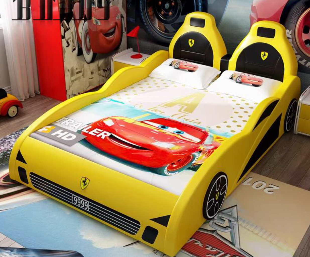 The Napoli Giallo commands attention through its masterful use of colour and authentic detailing. The immaculate yellow body is aggressively contrasted by sweeping, deep black aerodynamic side panels that visually lower the profile of the bed, perfectly mimicking the stance of a world-class supercar. The front fascia is a triumph of design, boasting a sleek, horizontal black slatted lower grille, stylised black faux-headlight accents, and a classic European-style “9999” custom license plate. Furthermore, the sweeping hood is proudly adorned with a classic yellow shield crest, paying direct homage to the legendary lineage of premium Italian grand tourers. Moving along the side profile, the bed features highly detailed, black and white multi-spoke alloy-style wheels seamlessly integrated into the soft frame, completing the magnificent illusion of a high-speed racing machine parked right in the bedroom.