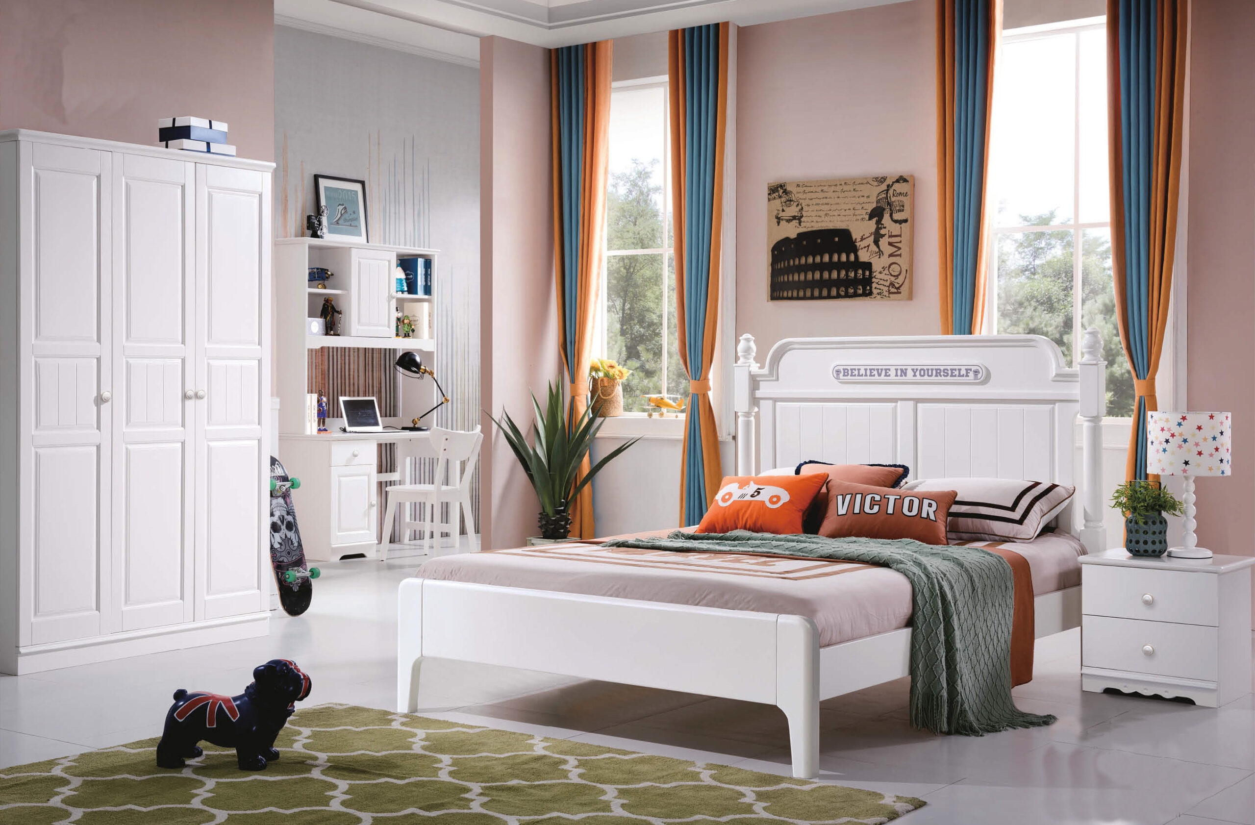• Features: “Believe in Yourself” motto badge, turned-post bed frame, integrated desk hutch, and 4-door wardrobe.