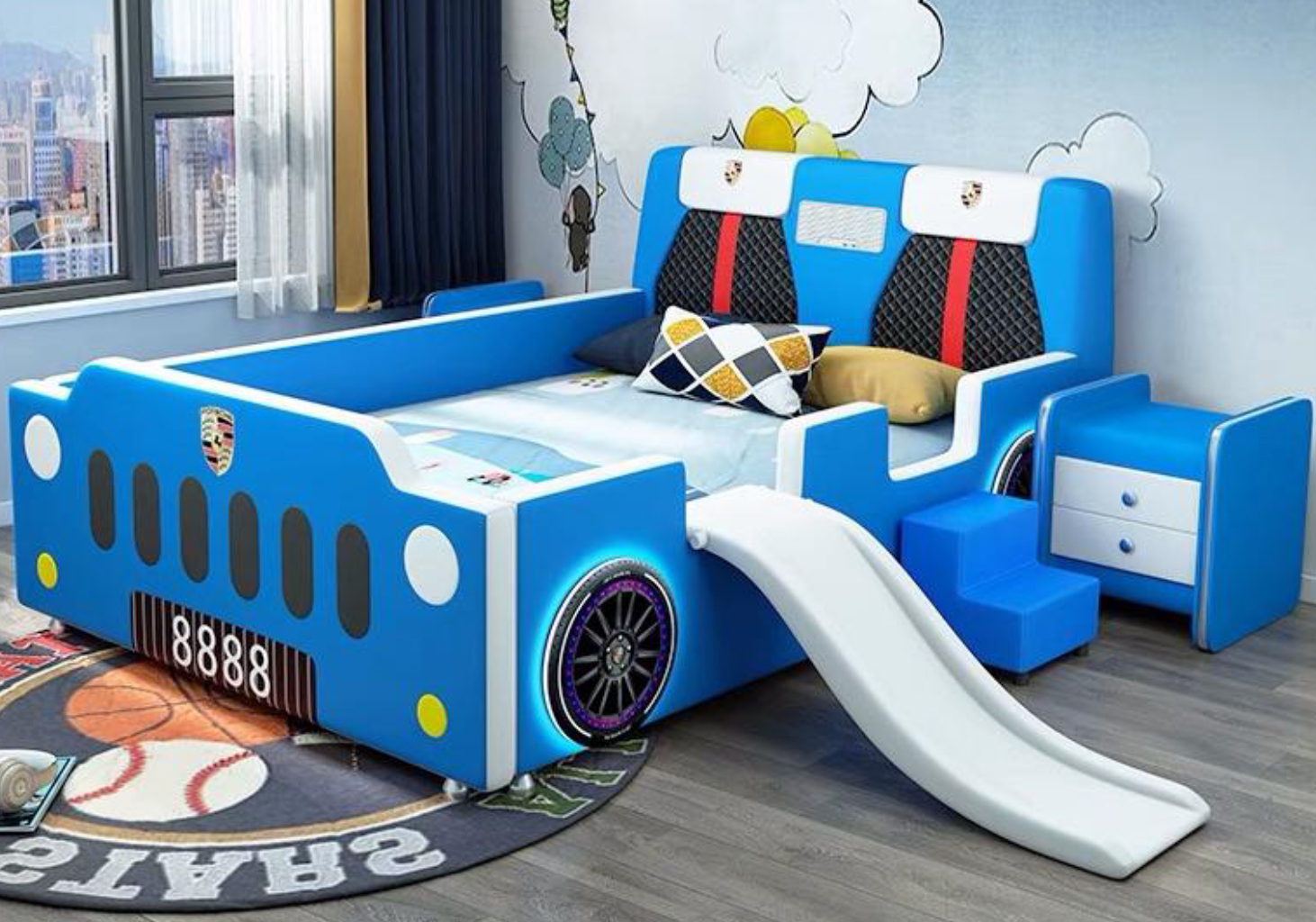 Elevate both playtime and bedtime with the Stuttgart Safari 4x4 Kids Bed, an ultra-premium blue off-road SUV frame featuring an exhilarating integrated slide, easy-climb entry stairs, and illuminated LED wheels. Expertly crafted for Australian families with a heavy-duty solid wood core and a spectacular diamond-quilted genuine leather headboard, this statement piece guarantees endless daily adventure and uncompromising night-time safety.