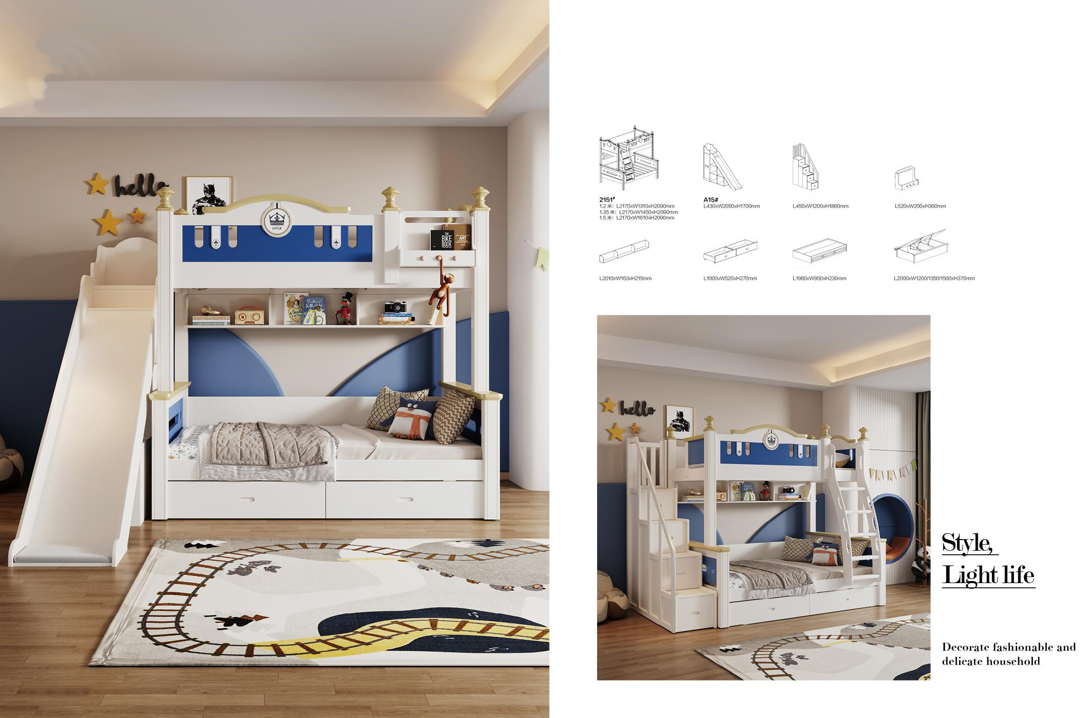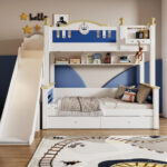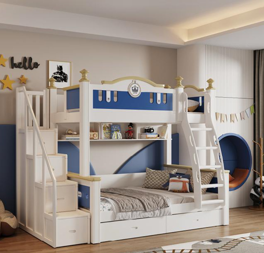 The rich Navy and White palette is an interior decorator’s dream. For a classic coastal look, style the room with crisp white linen, woven rattan baskets, and subtle striped rugs. To lean into a more traditional “Royal” theme, incorporate rich velvet cushions in mustard yellow or burgundy, alongside warm brass lighting fixtures. The bed’s distinguished design guarantees it will remain a stylish foundation for their room for over a decade.