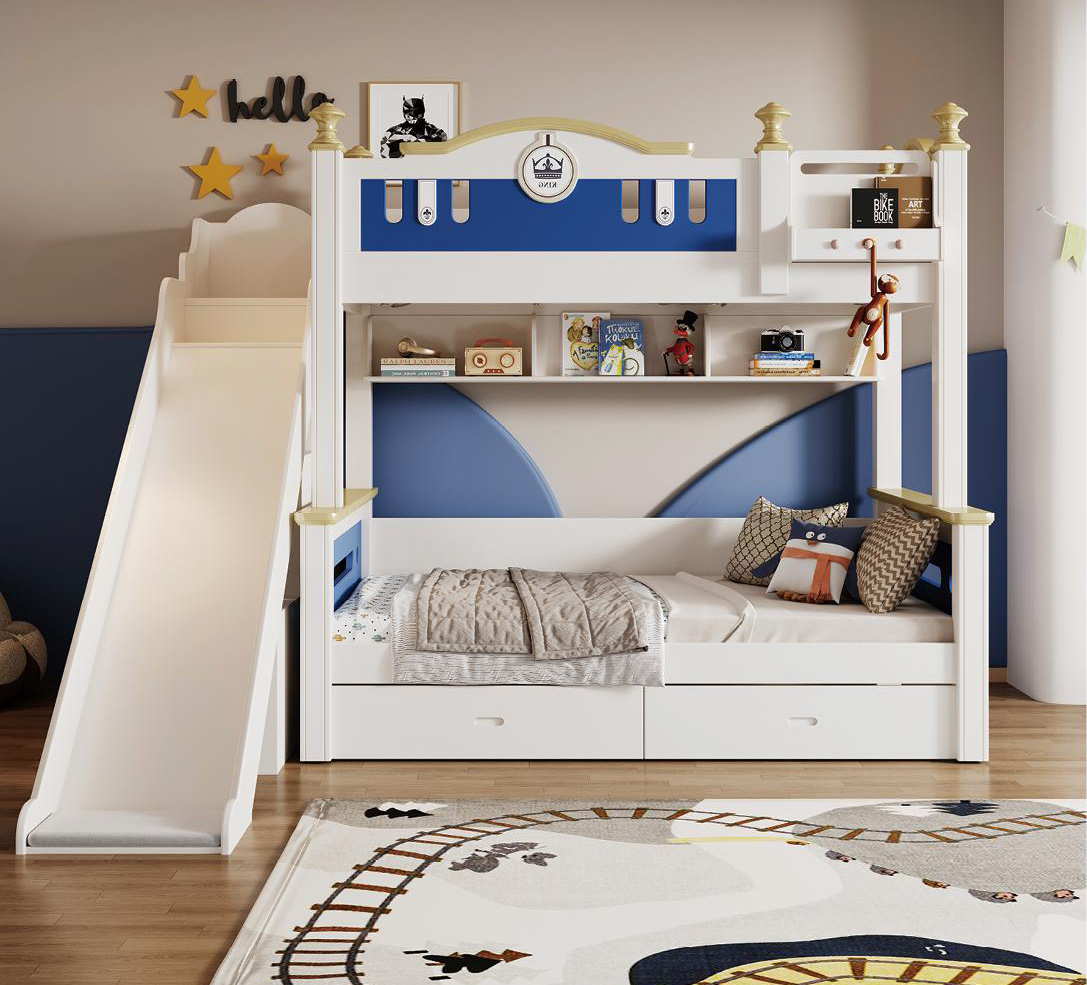 Designing a shared bedroom for boys—or creating the ultimate room for hosting sleepovers—requires furniture that is exceptionally durable, highly functional, and aesthetically inspiring. The Windsor Royal Crest Bunk Bed Suite sets a new standard for children’s luxury furniture at Maison Clair De Lune. It successfully bridges the gap between a playful childhood fort and a sophisticated, architecturally inspired bedroom suite.