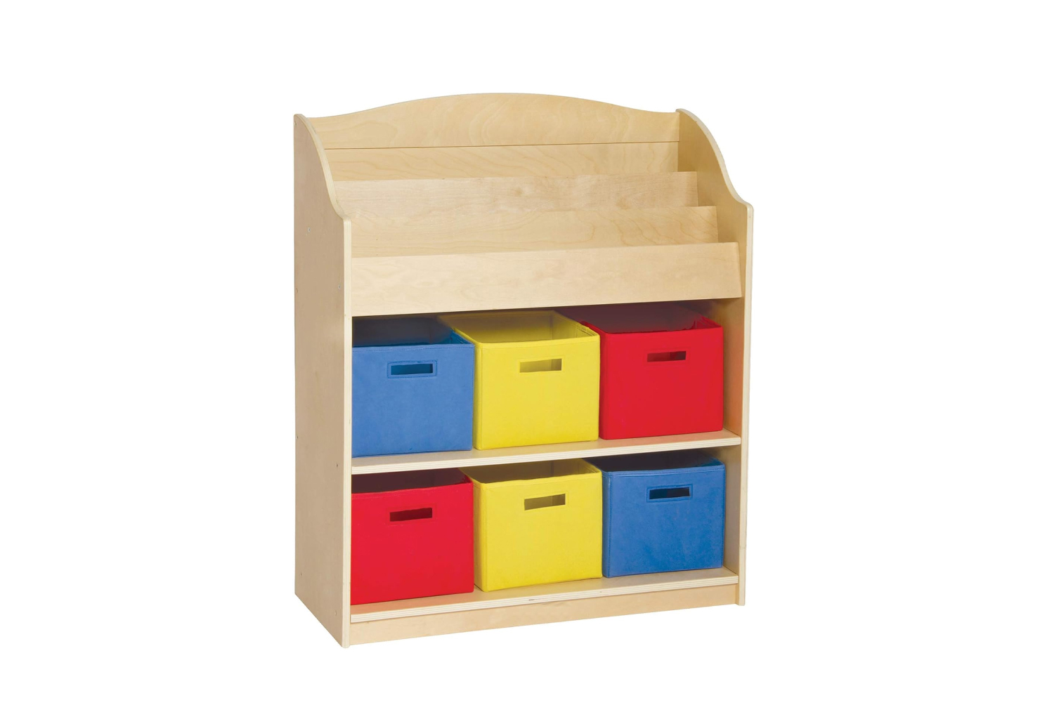 • Design: Multi-tiered forward-facing library display with integrated bin storage